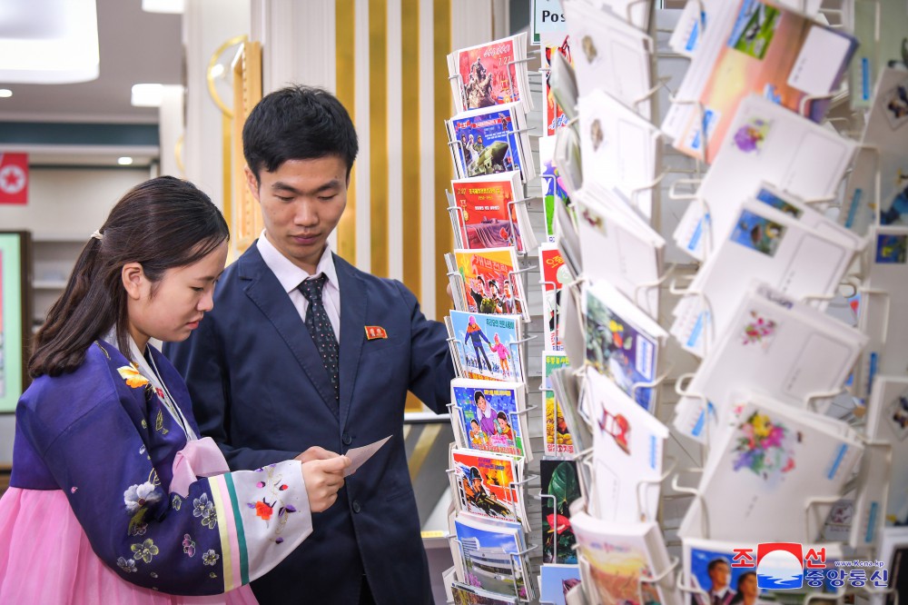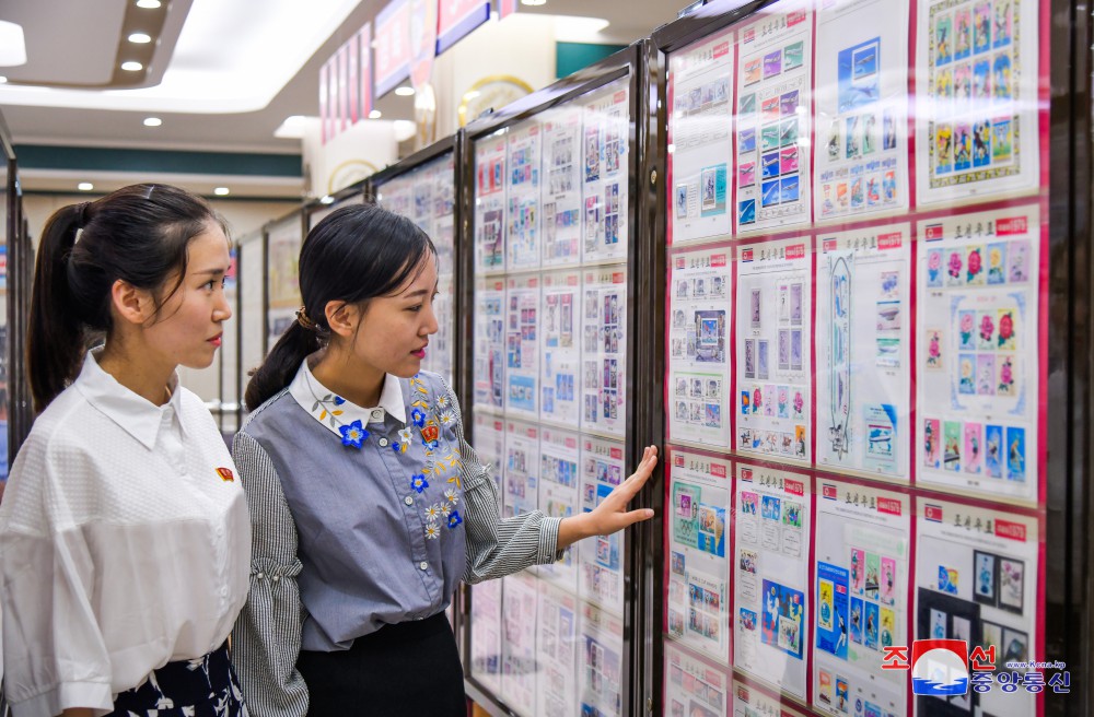Ve výstavní síni jsou vystaveny poštovní známky s fotografiemi velkého vůdce soudruha Kim Ir Sena, velkého vůdce soudruha Kim Čong Ila a váženého soudruha Kim Čong Una.