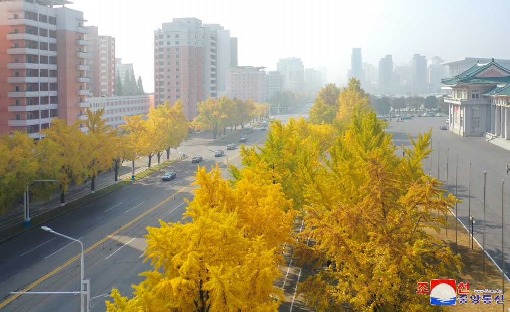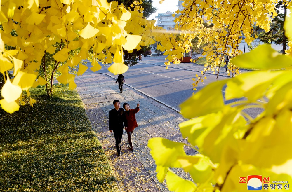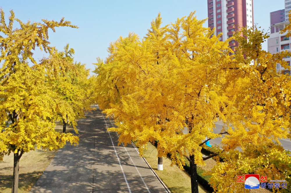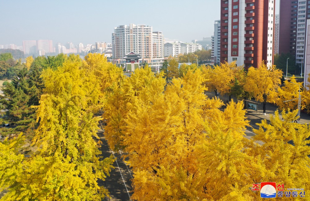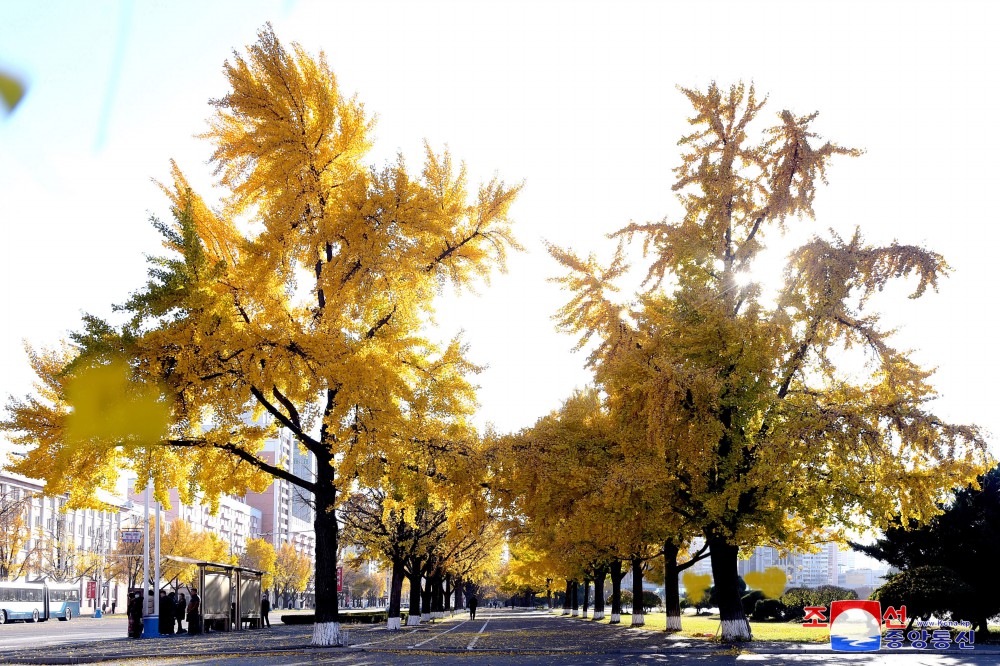 Pchjongjang 6. listopadu čučche 113 (2024) /KCNA/ – Nádherná scenérie stromů ginkgo (jinanů dvoulaločných) zbarvených podzimním listím na ulicích umocňuje podzimní sezónu a dodává kouzlo Pchjongjangu.