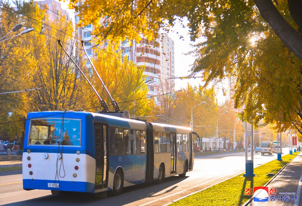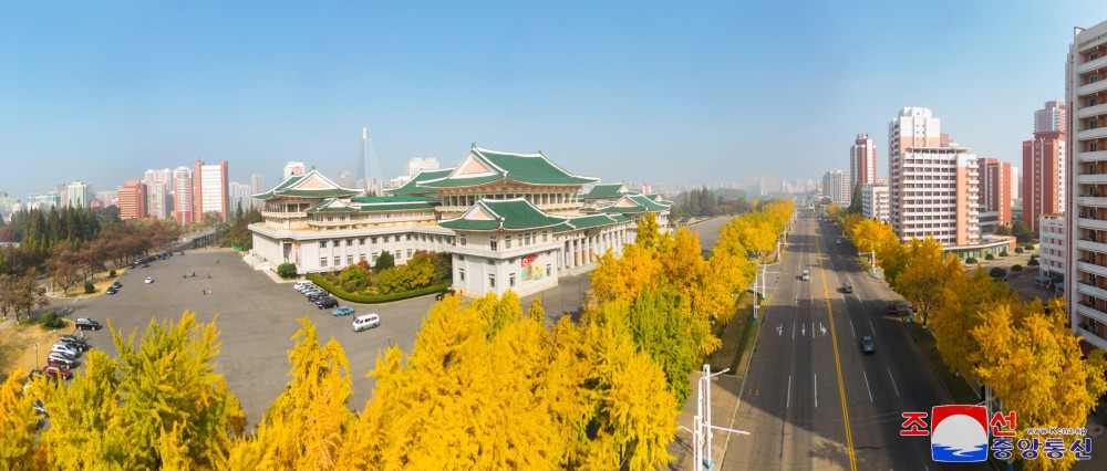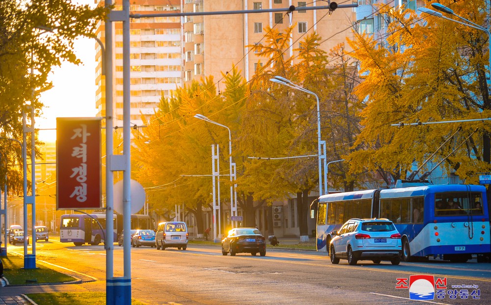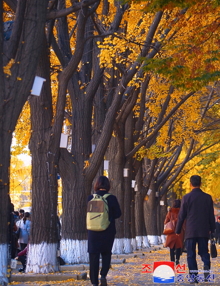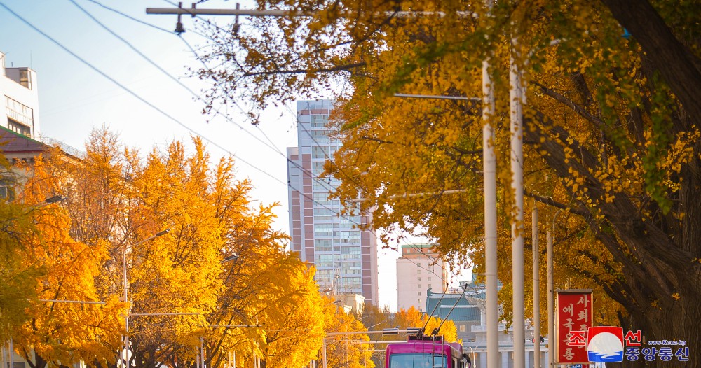 Pchjongjang 6. listopadu čučche 113 (2024) /KCNA/ – Nádherná scenérie stromů ginkgo (jinanů dvoulaločných) zbarvených podzimním listím na ulicích umocňuje podzimní sezónu a dodává kouzlo Pchjongjangu.
