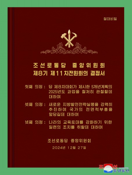 Pchjongjang 29. prosince čučche 113 (2024) /KCNA/ – 23. – 27. prosince se v sídle Ústředního výboru strany – nejvyšším štábu revoluce – konalo rozšířené 9. plenární zasedání 8. Ústředního výboru Korejské strany práce, jehož cílem bylo shrnout pozoruhodné úspěchy dosažené v roce 2024 neodolatelnou silou vlastní našemu státu, našemu lidu, překonávající zkoušky a výzvy, a stanovit směr a plán rozvoje práce strany a vlády pro rok 2025, který se stane dalším předělem v dějinách růstu a rozvoje naší strany a republiky.