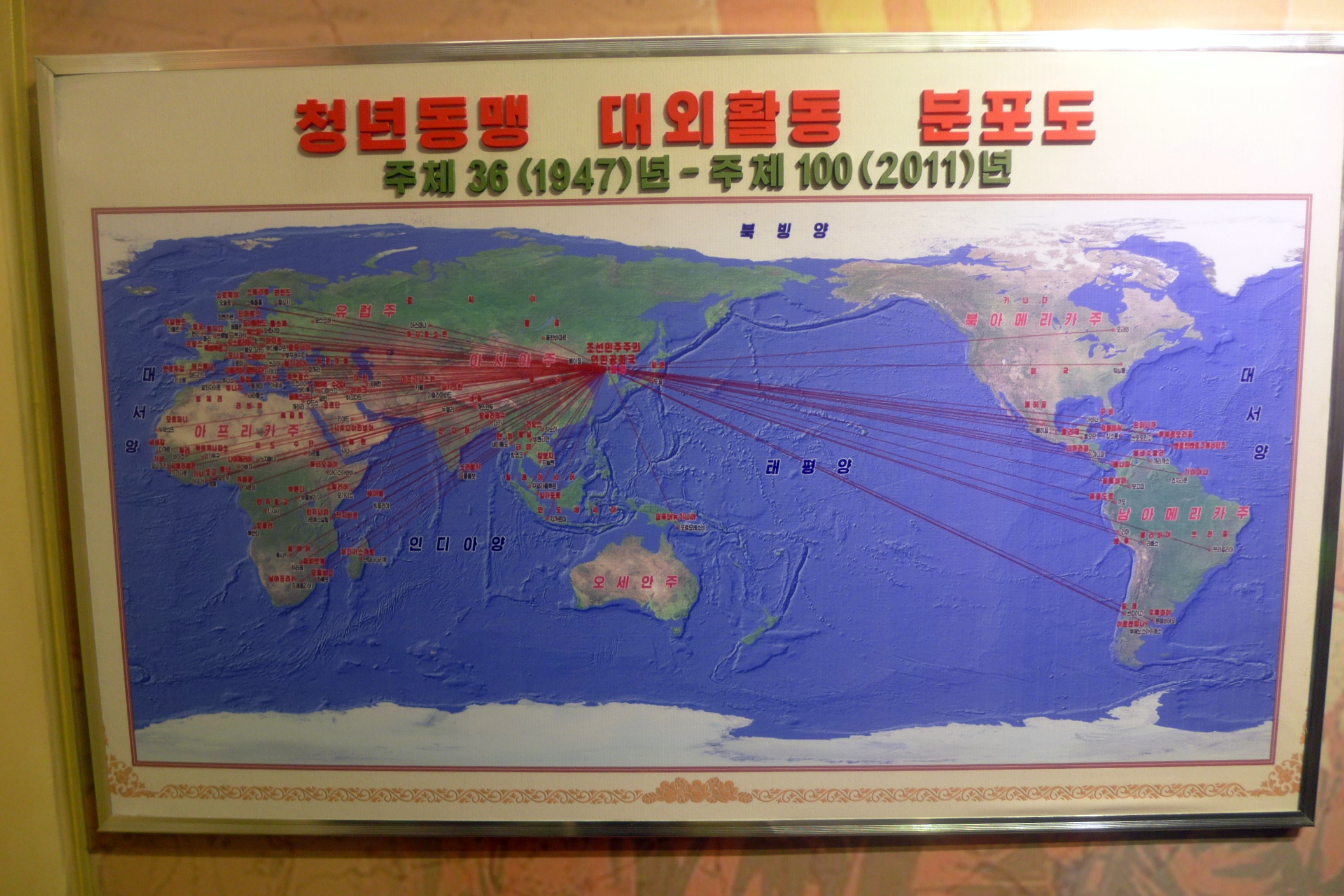 Mapa zahraničních cest delegací Kim Ir Senova socialistického svazu mládeže (dnes Kimirsensko-kimčongilského svazu mládeže)