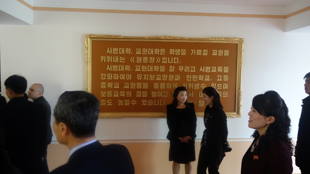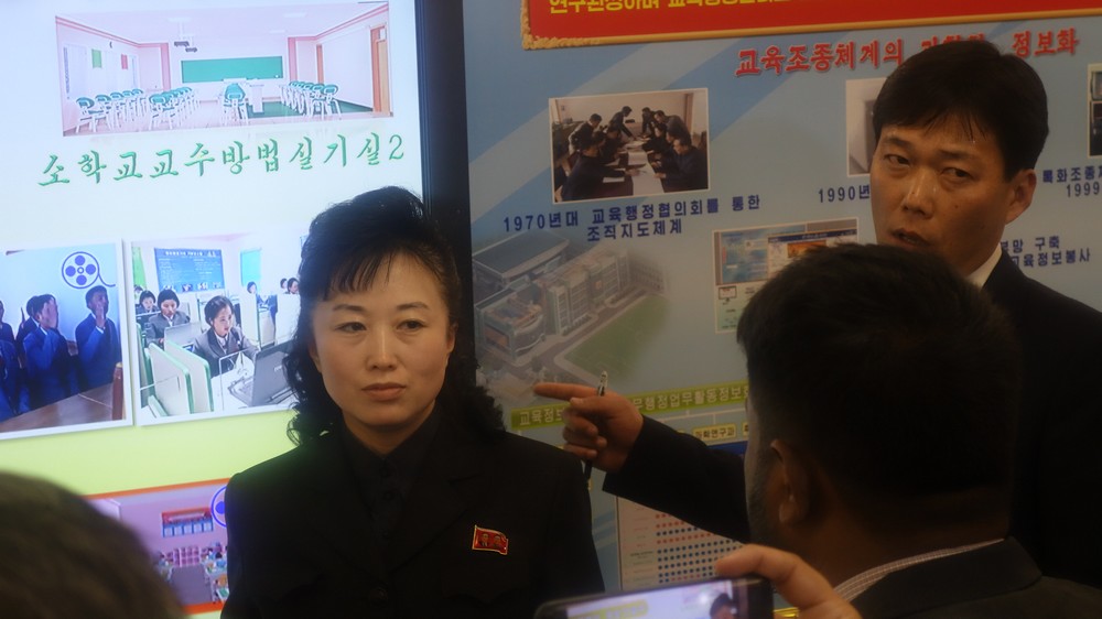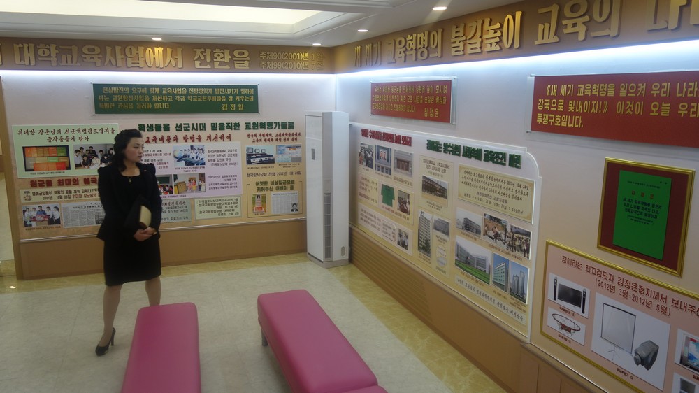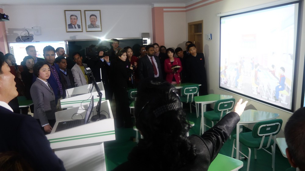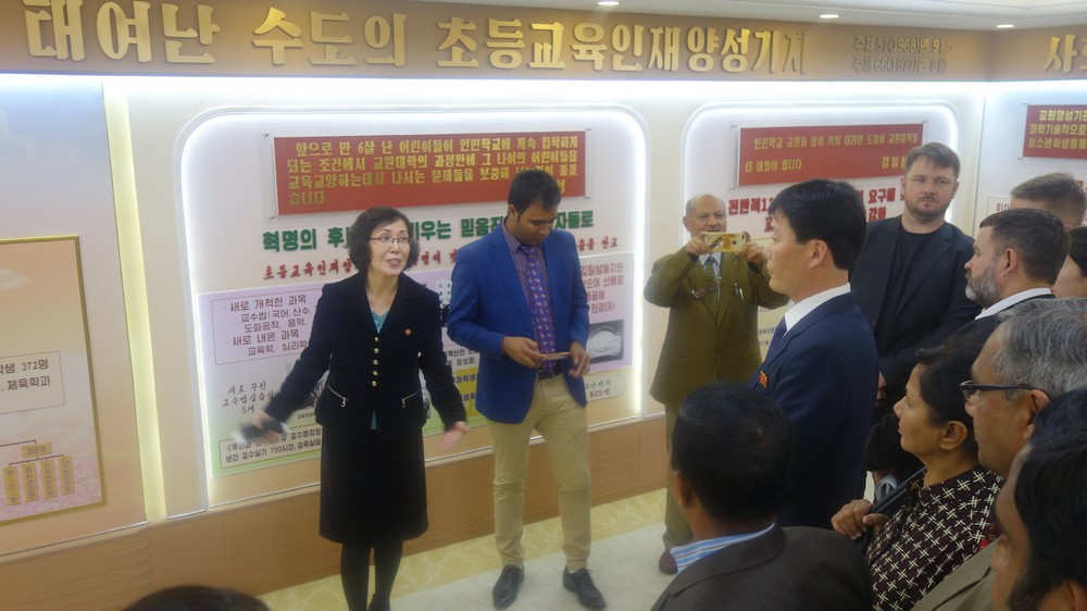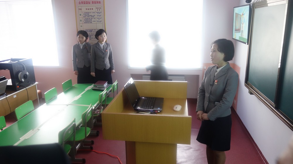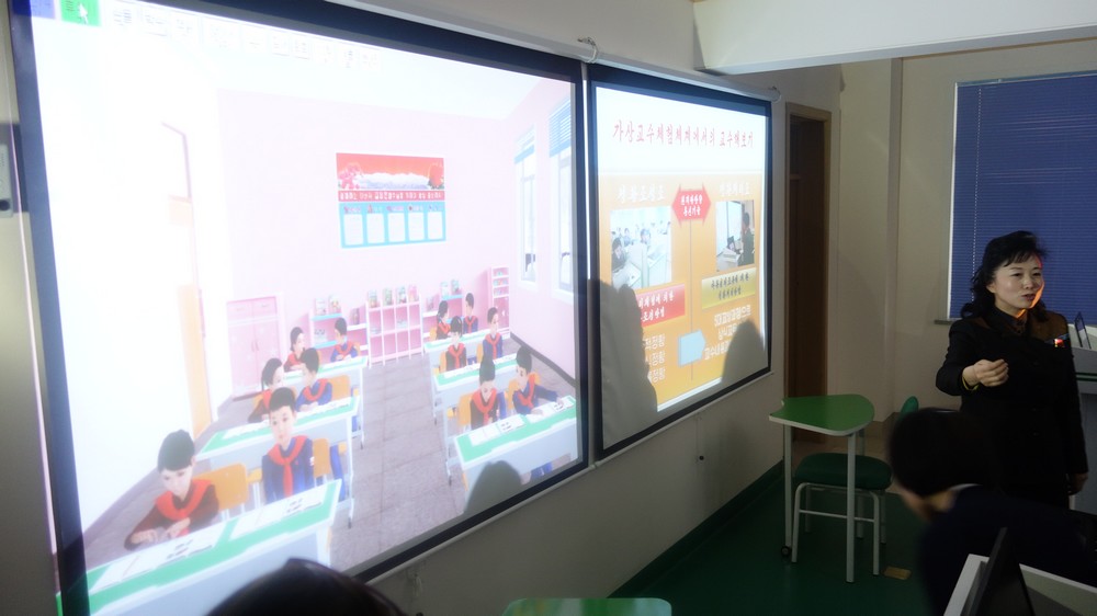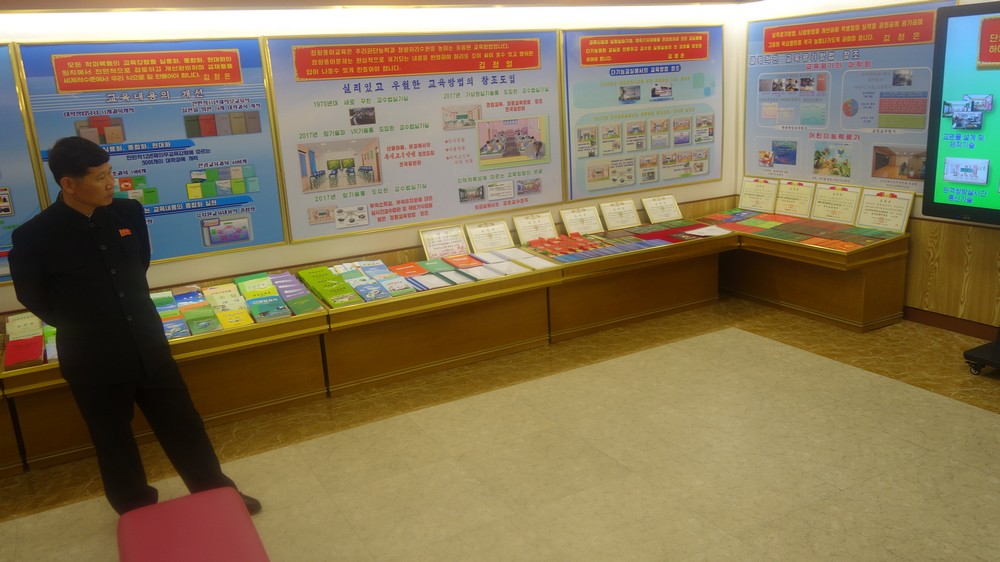 Zaujal nás zejména počítač k simulaci výuky v korejštině i v angličtině. Animovaní žáci, v souladu se skutečností KLDR v pionýrských uniformách, vzorně odpovídají na pokyny a otázky učitelky v korejštině i angličtině. (V korejštině se nepoužívá název „pionýr“, ale „Svaz dětí“ – Sonjondan.) Stejně jako dospělí v celé společnosti, také žáci jsou oslovováni „soudruzi“. Všechny učebny i chodby institutu jsou vyzdobeny působivými agitačními nástěnkami a citáty velkých vůdců. Školství v KLDR je zcela bezplatné a žákům i studentům jsou zdarma poskytovány i uniformy.