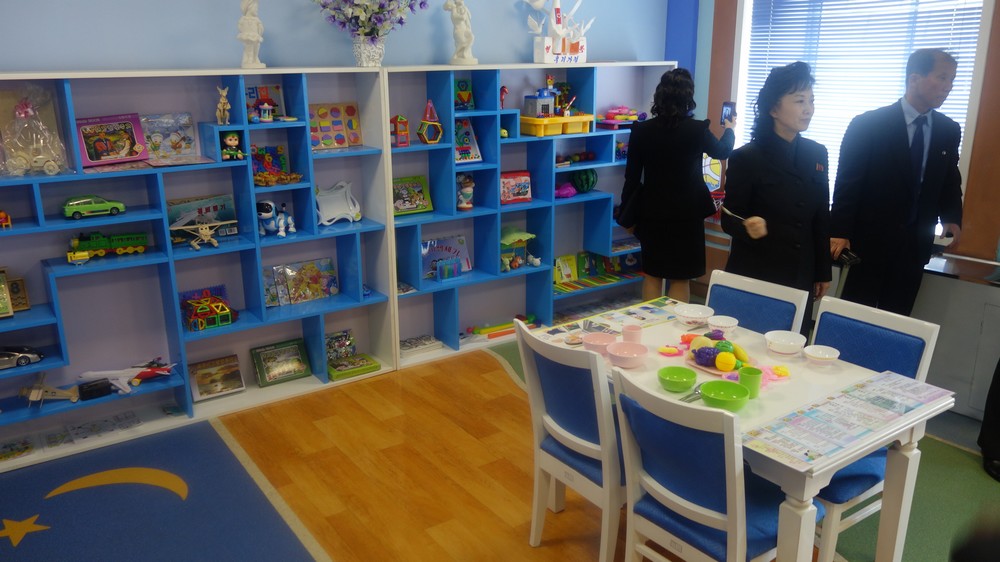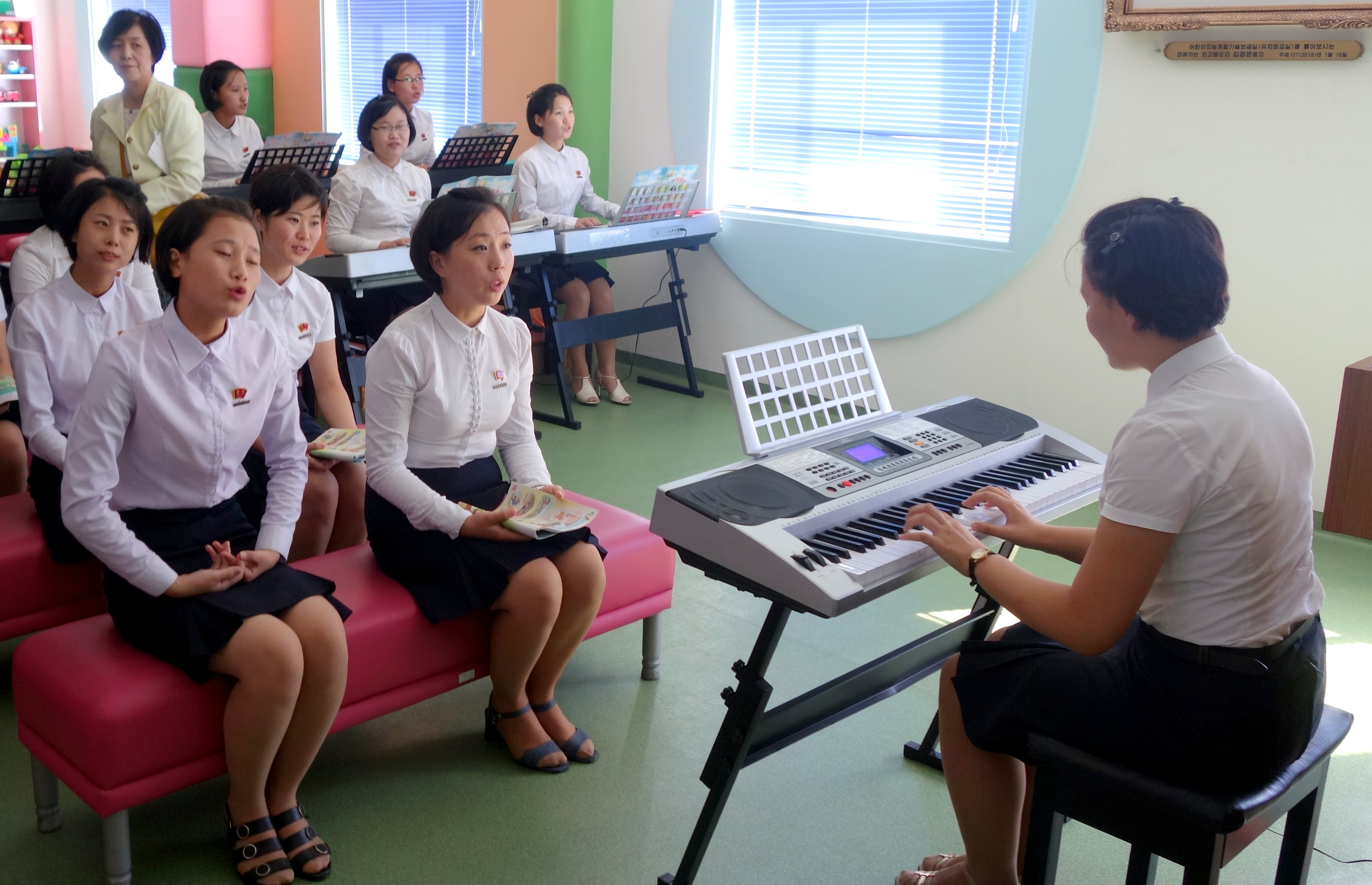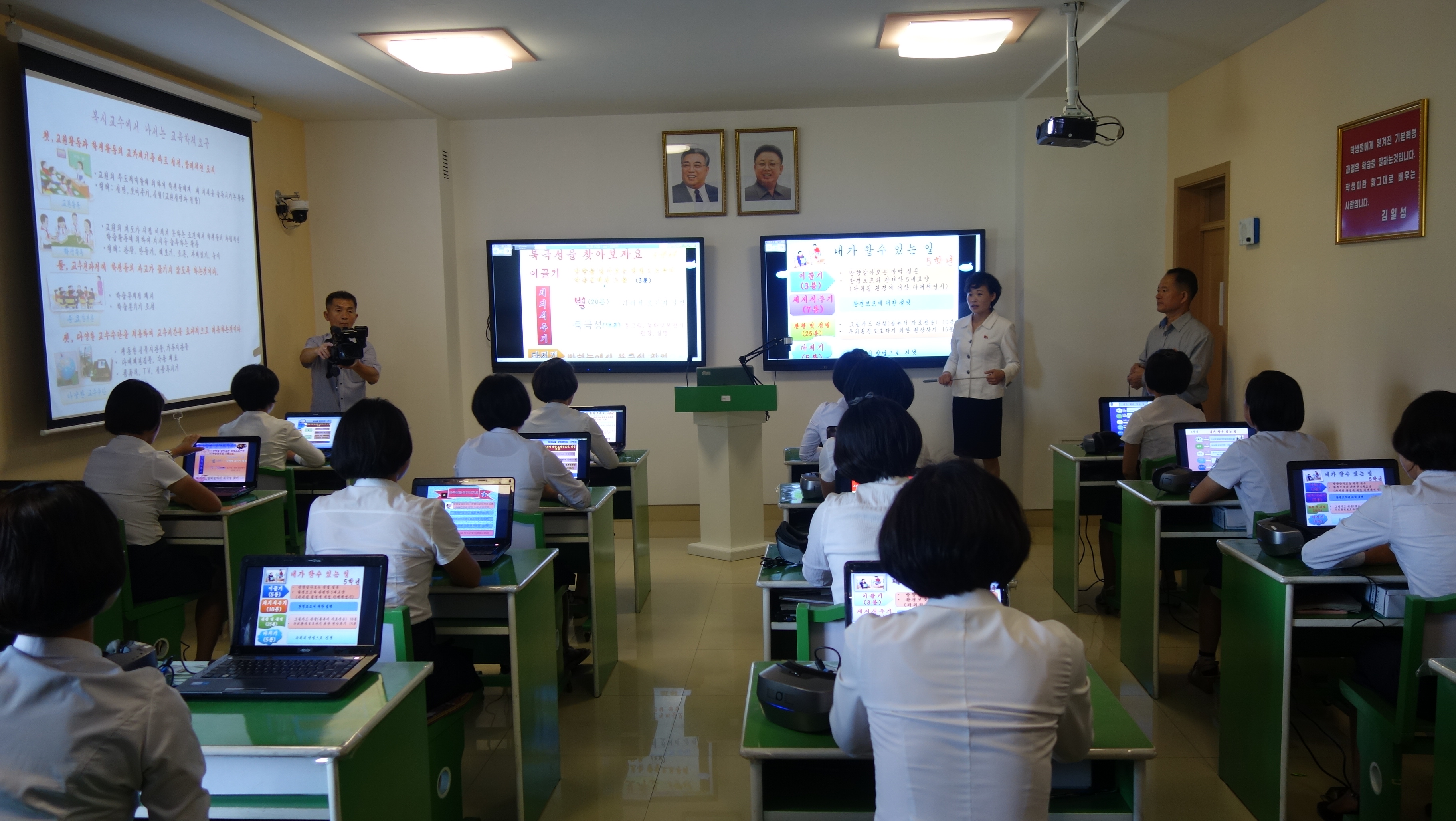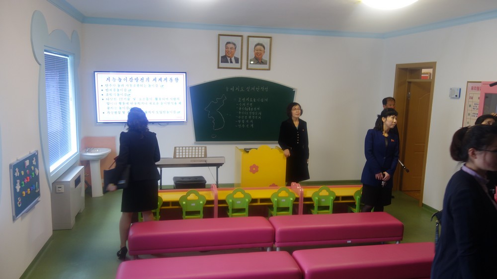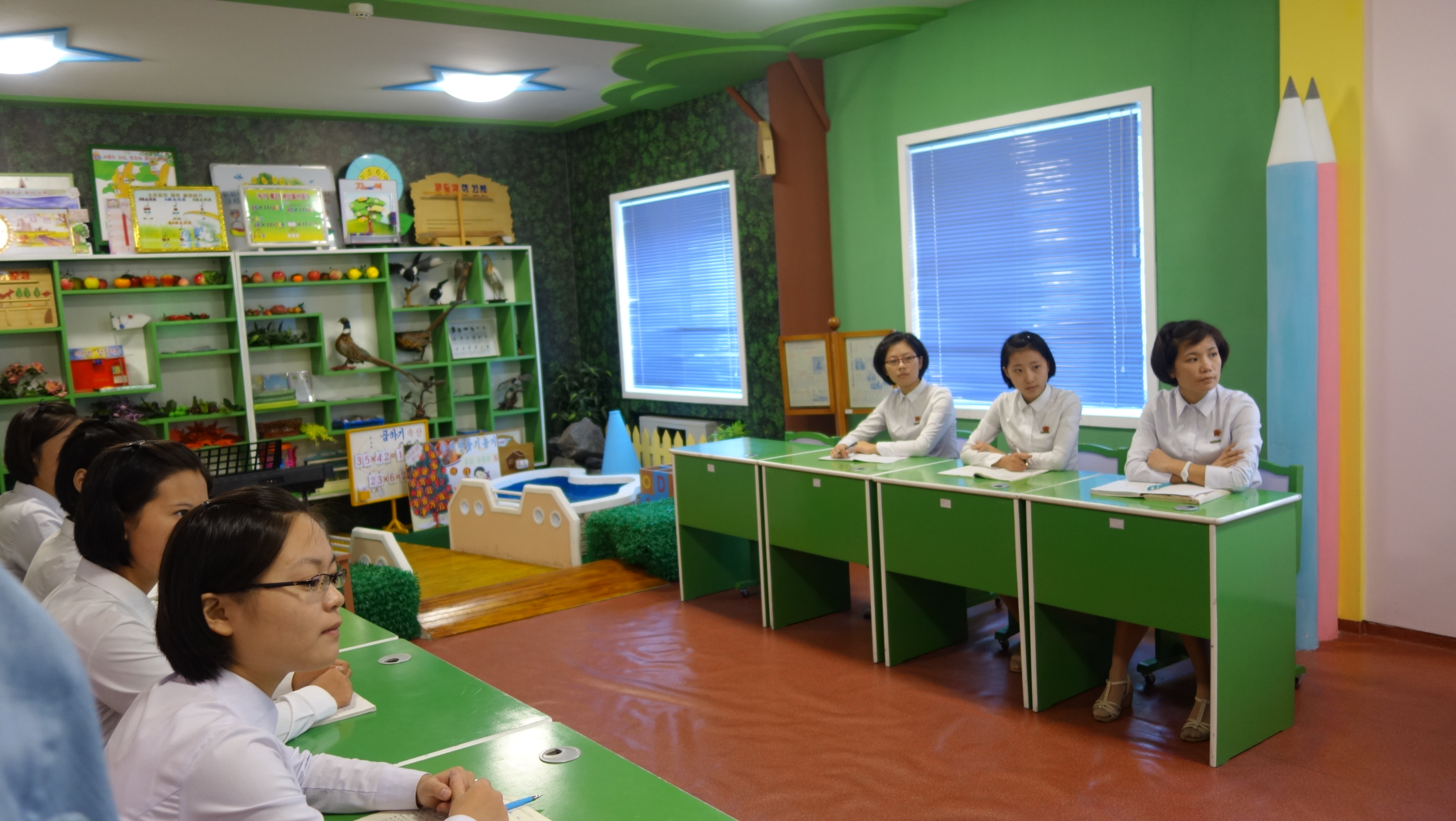 Zaujal nás zejména počítač k simulaci výuky v korejštině i v angličtině. Animovaní žáci, v souladu se skutečností KLDR v pionýrských uniformách, vzorně odpovídají na pokyny a otázky učitelky v korejštině i angličtině. (V korejštině se nepoužívá název „pionýr“, ale „Svaz dětí“ – Sonjondan.) Stejně jako dospělí v celé společnosti, také žáci jsou oslovováni „soudruzi“. Všechny učebny i chodby institutu jsou vyzdobeny působivými agitačními nástěnkami a citáty velkých vůdců. Školství v KLDR je zcela bezplatné a žákům i studentům jsou zdarma poskytovány i uniformy.